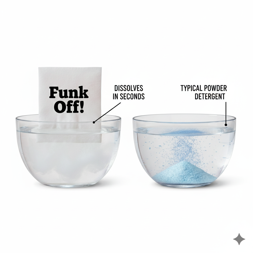 Apart from the convenience of just tossing a sheet into your washer and not having to carry a heavy bottle that leaks and drips when you wash, Funk Off! is pre-measured for the right amount for typical load sizes. It rinses thoroughly unlike pods, liquids, and powder.